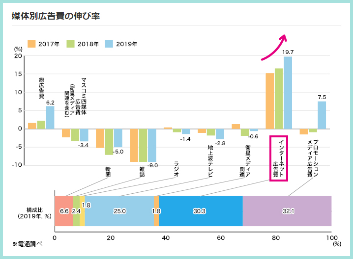 近年、新聞・雑誌・ラジオ・テレビなど既存メディアの広告費が軒並み毎年下がっていく中、インターネット広告費は、毎年右肩上がりで伸びておりますが、その伸びに対して、Webマーケティング業界で活躍するプレイヤーが少ないため、慢性的な人材不足に陥っています。